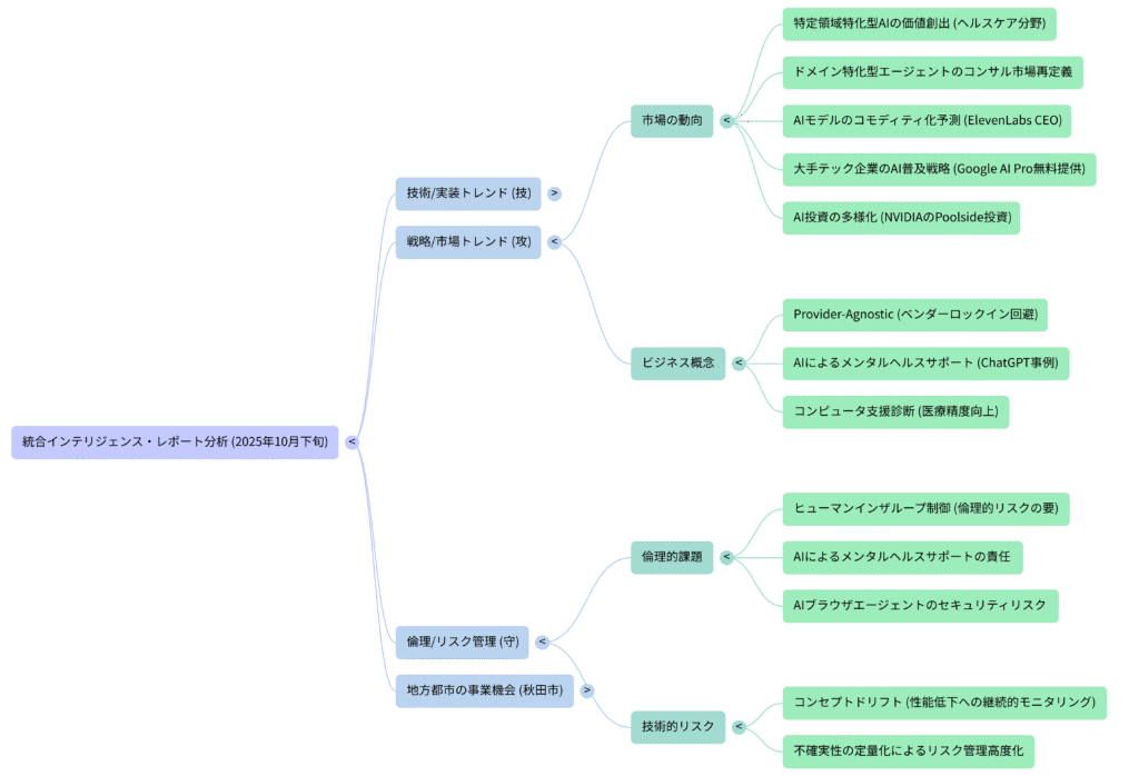 これら「専門特化」「リスク管理」「開発の民主化」という3つの潮流は、それぞれが独立しているわけではありません。【技】としての開発ツールの「民主化」は、あらゆる企業が地域の資産を活かす【攻】としての「専門特化」AIを構築することを可能にし、同時に組み込まれた【守】としての「リスク管理」フレームワークが、その強力なツールが安全に導入され、社会からの信頼を得ることを保証します。この3つが一体となって、新たなビジネスを推進する強力なエンジンとなるのです。